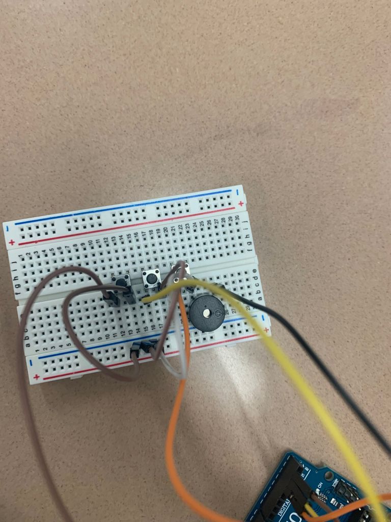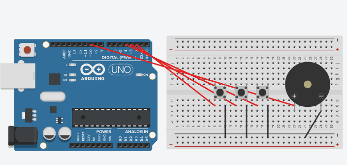 For this circuit, I used 3 buttons and a buzzer. The 3 buttons and the buzzer are all connected to the Arduino. If you click any of the buttons, the buzzer will turn on making a noise. Optionally, you could use a potentiometer to control the volume but I decided not to. I used code from SparkFun