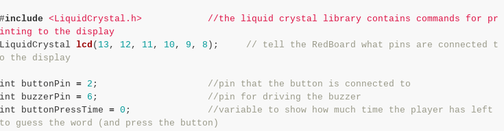 Unfortunately I couldn’t get this one to work so I have no pictures. I watched a lot of videos on LCD displays and realized the problem was not in the code, but a small piece of plastic and metal inside connecting 2 pins was missing (which would light up the LCD screen). I did manage to get the code working. The code was a bit tricky because it used an LCD screen with 8 pins, but the LCD screens we were provided had 4. Code from Sparkfun